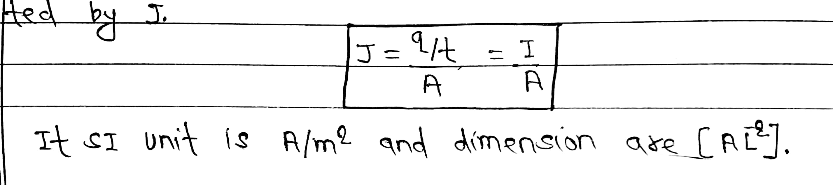 It is a vector quantity having the same direction as that of motion of the positive charge. It is a characteristic property of any point inside the conductor. It is denoted by j.