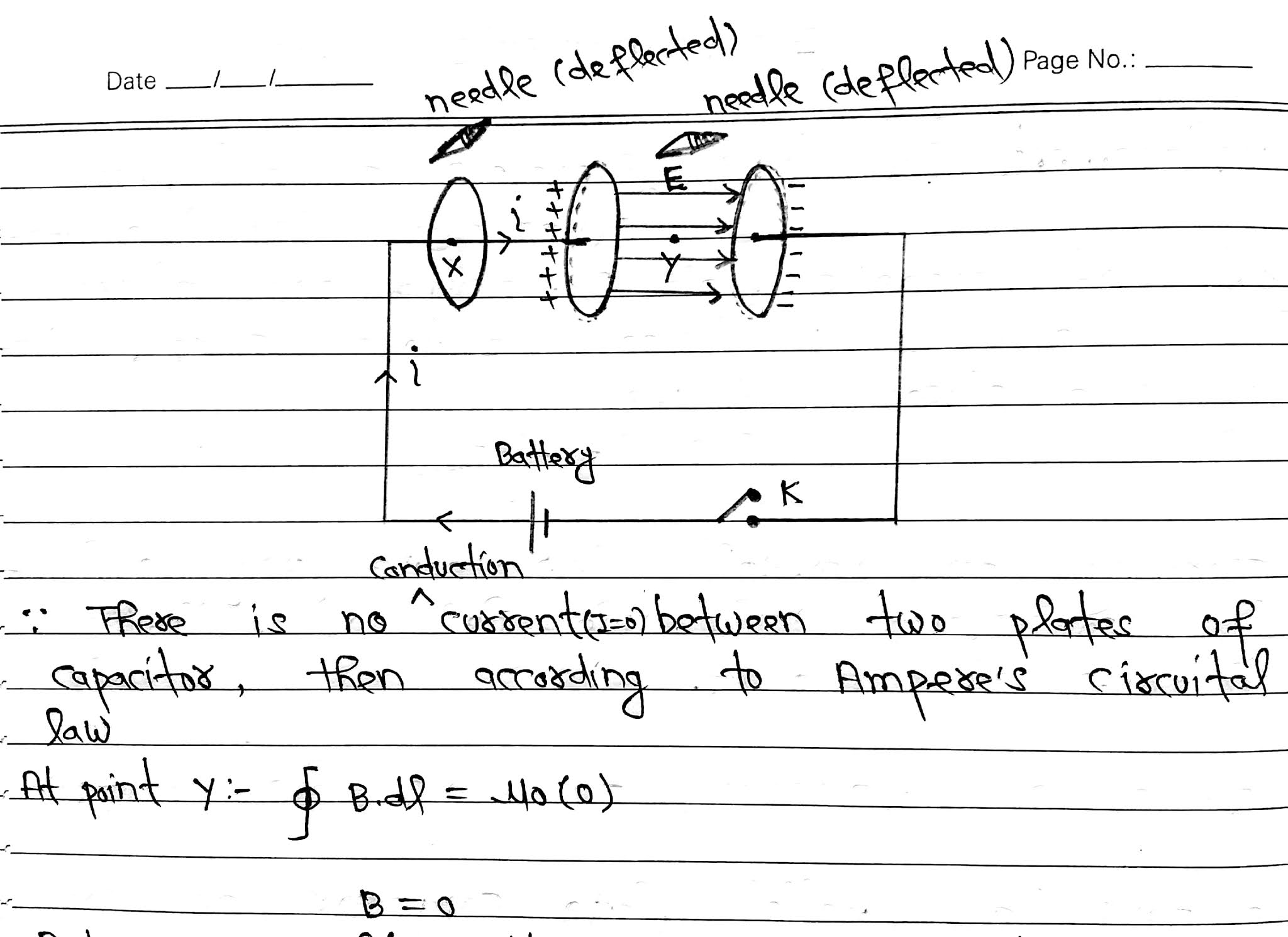 But in reality it was not correct, because when Maxwell put magnetic needle between two plates it get deflected. He shocked that why this magnetic needle get deflected, while there is no any conduction current between these two plates.