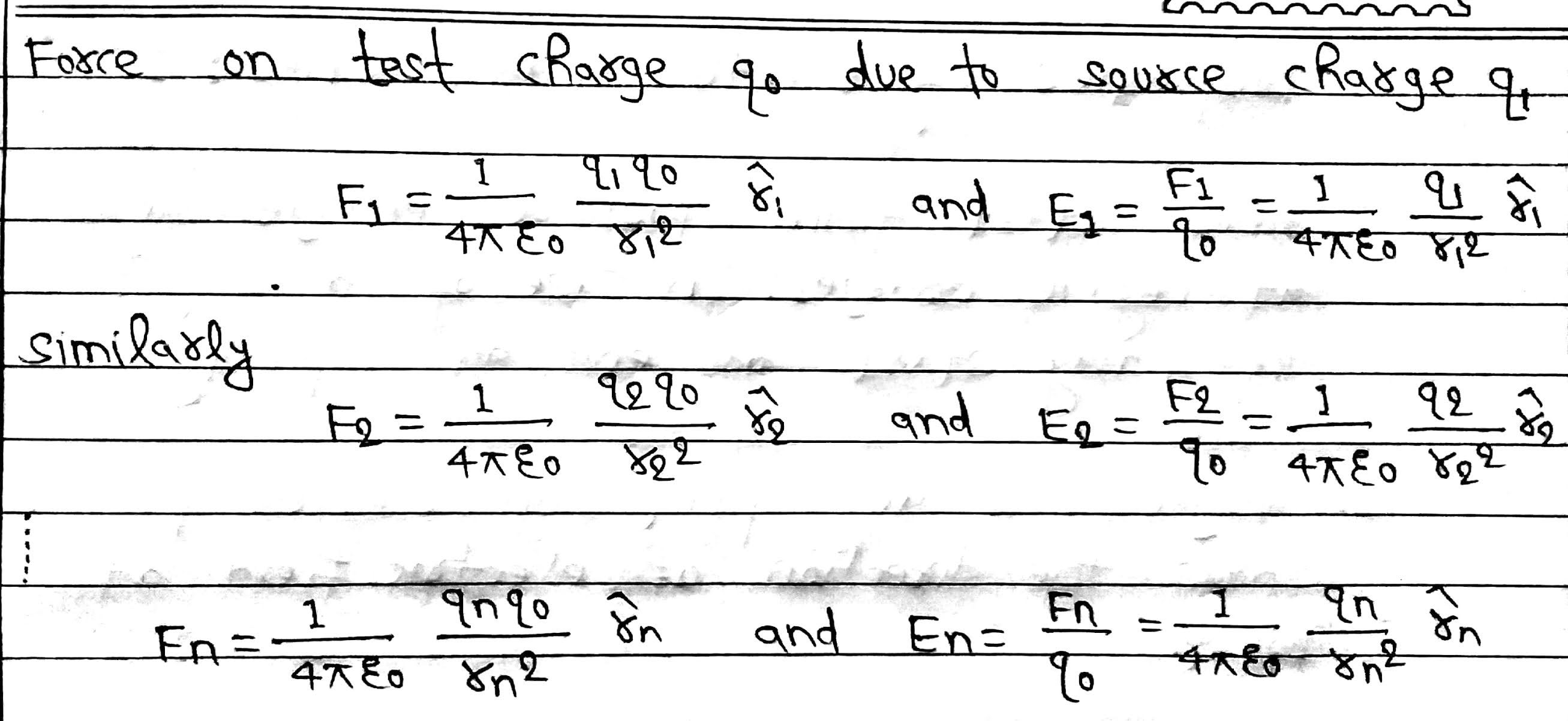 Let we consider n point charges q₁, q₂, q₃,…… qₙ with position vector r₁, r₂, r₃……rₙ exert forces F₁, F₂, F₃,…..Fₙ on test charge q₀ placed at origin O.