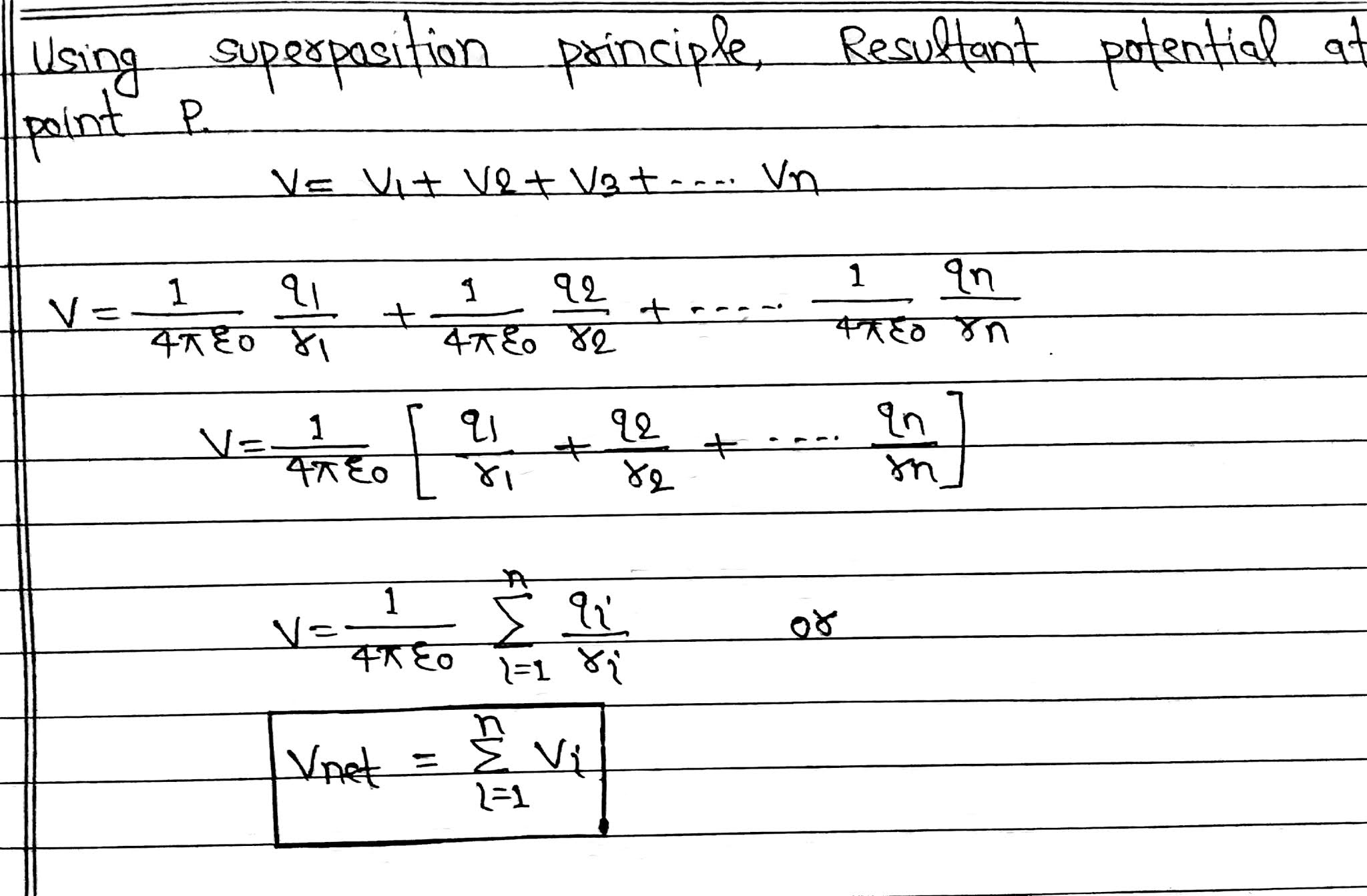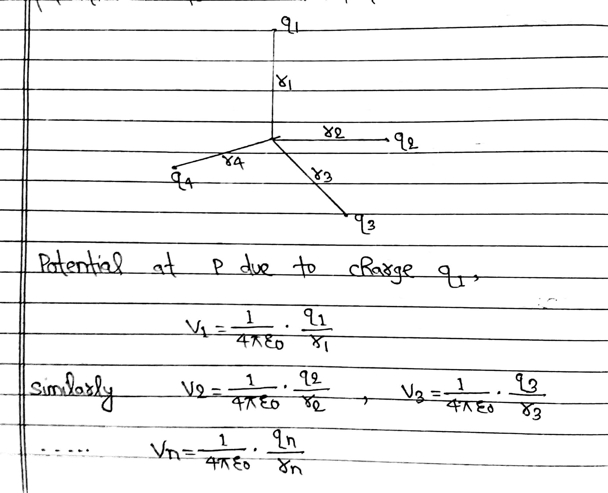 Let there are n number of point charges q₁, q₂, q₃……. qn at distances r₁, r₂, r₃,…….. rn respectively from the point P, where electric potential is to be calculated.