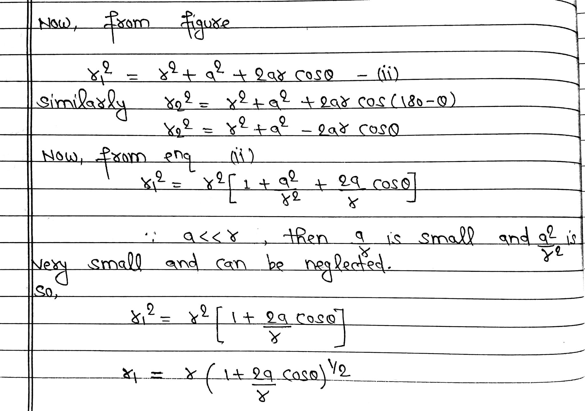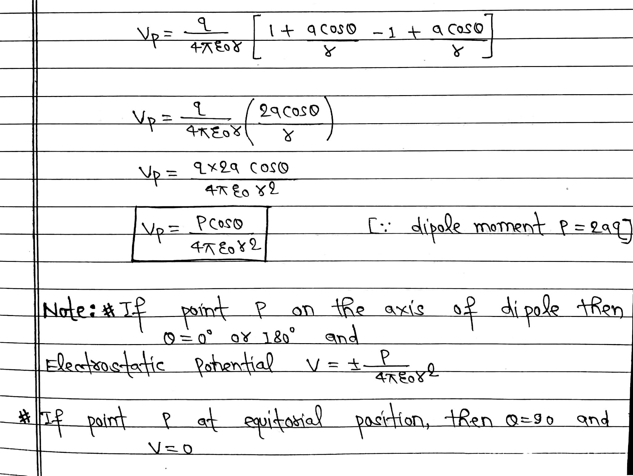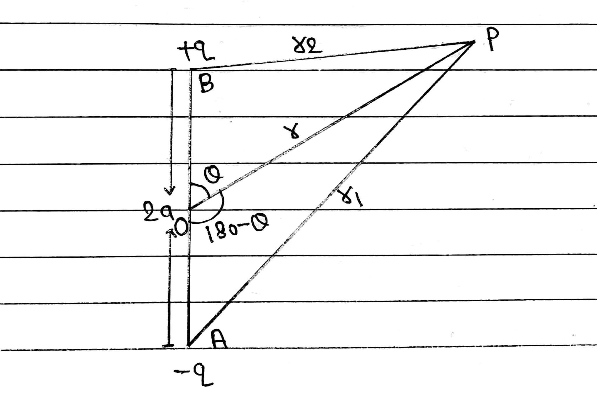 Let O be the centre of dipole, P be any point near the electric dipole inclined at an angle θ.
