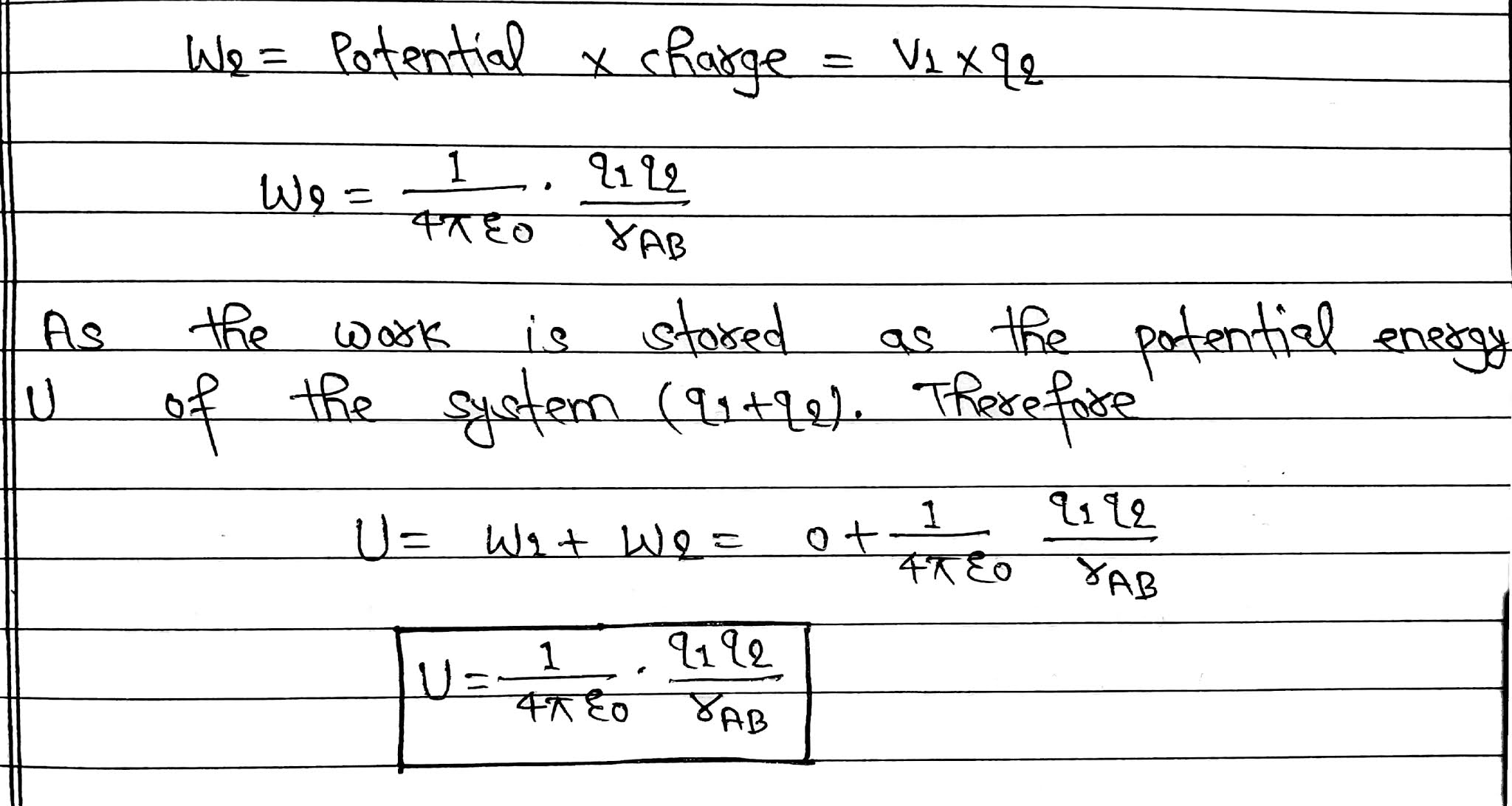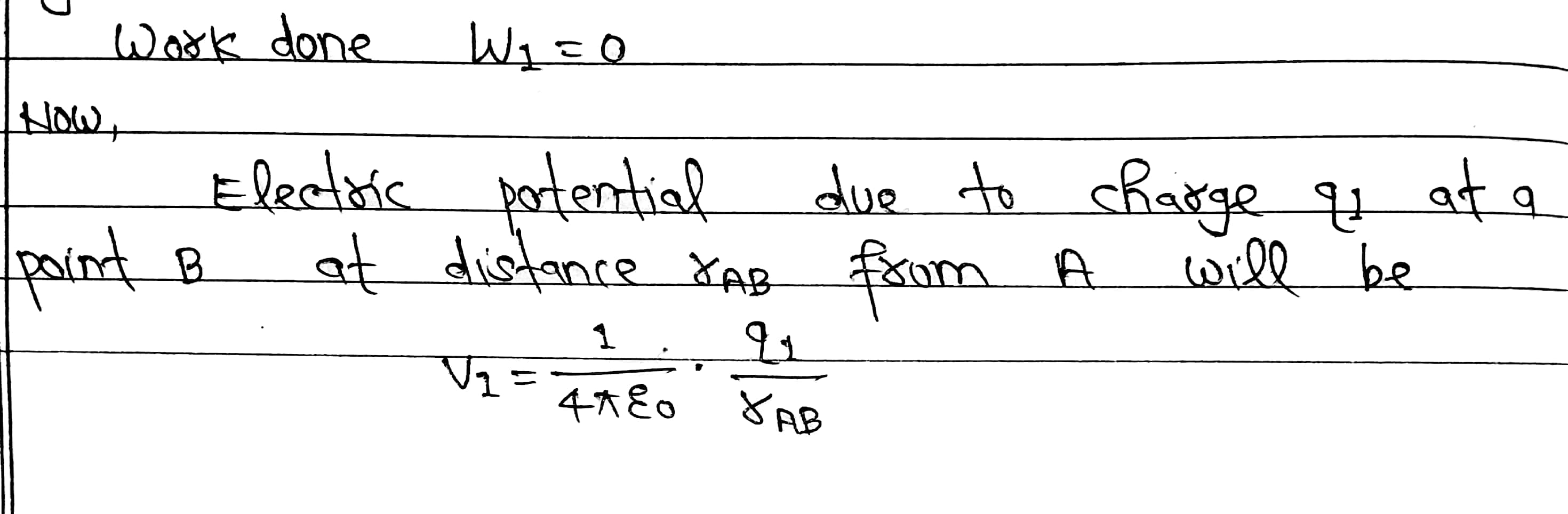 Let a point charge q₁ is at rest at a point A in space. It takes no work to bring the first charge q₁ because there is no any electric field yet to work against. So