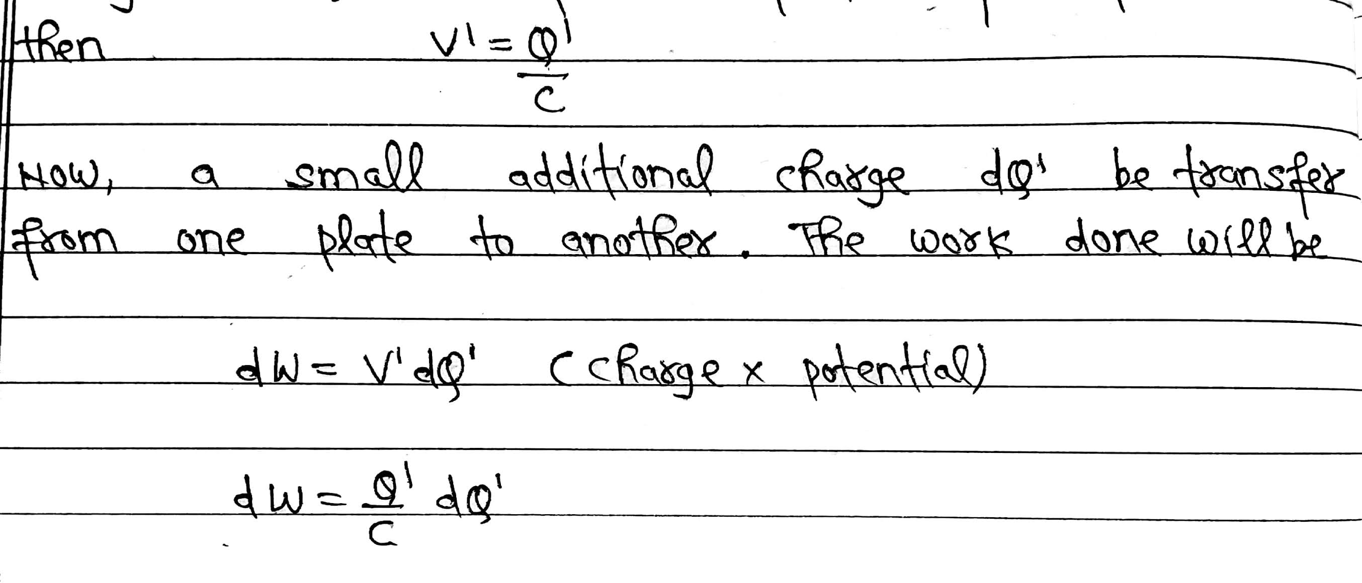 Let we consider a capacitor of capacitance C. Initial its two plates are uncharged. let we have to move small positive charges from one plate and transfer them to the other plate. let potential difference be Vⁱ and charge is Qⁱ on positive plate of capacitor.