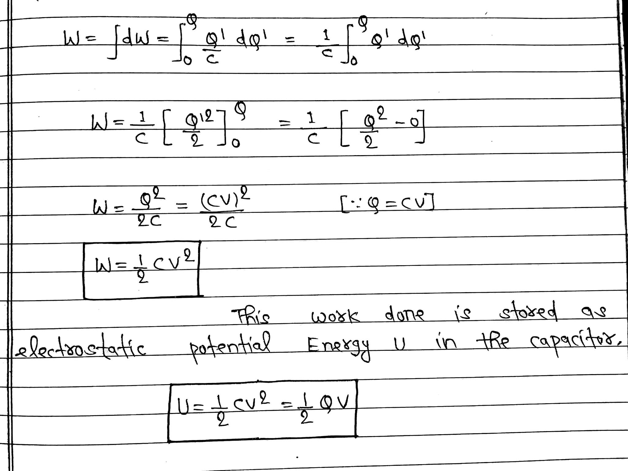 The energy of a charged capacitor is measured by the total work done in charging the capacitor to a given potential. The work done in charging the capacitor is stored as its electrical potential energy.