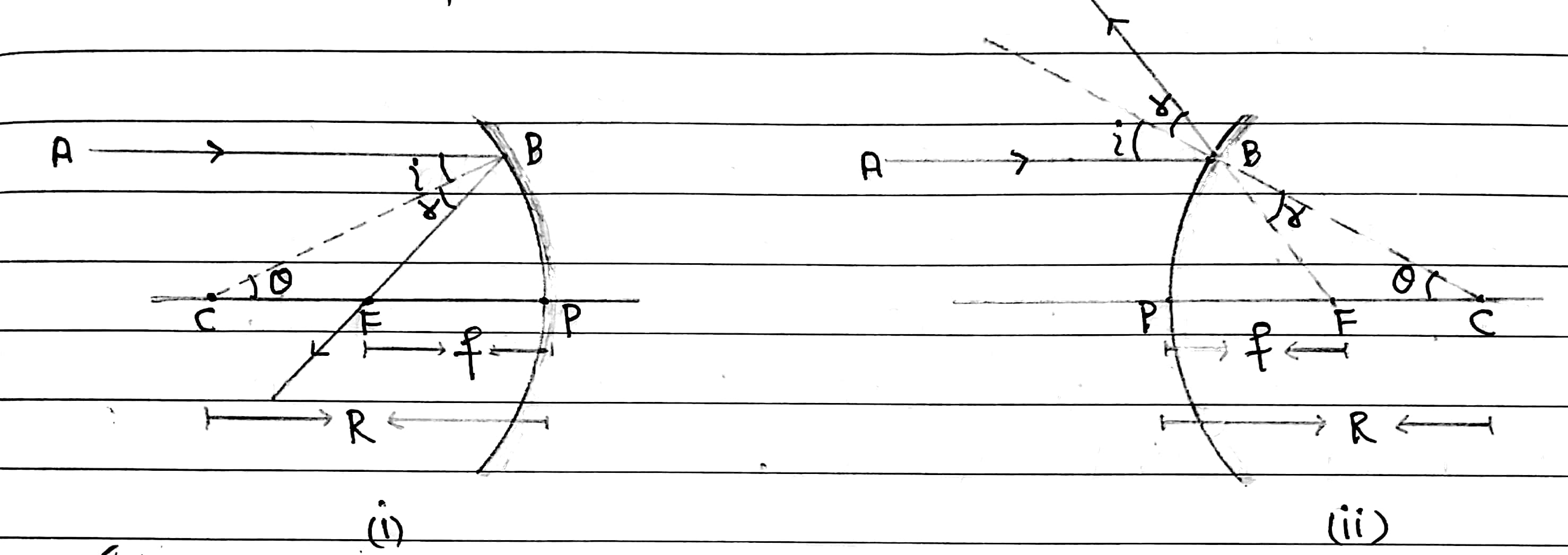Thus F is the focus of the mirror, C is the centre of curvature, CP= the radius of curvature and BC is a normal to the mirror at point B.