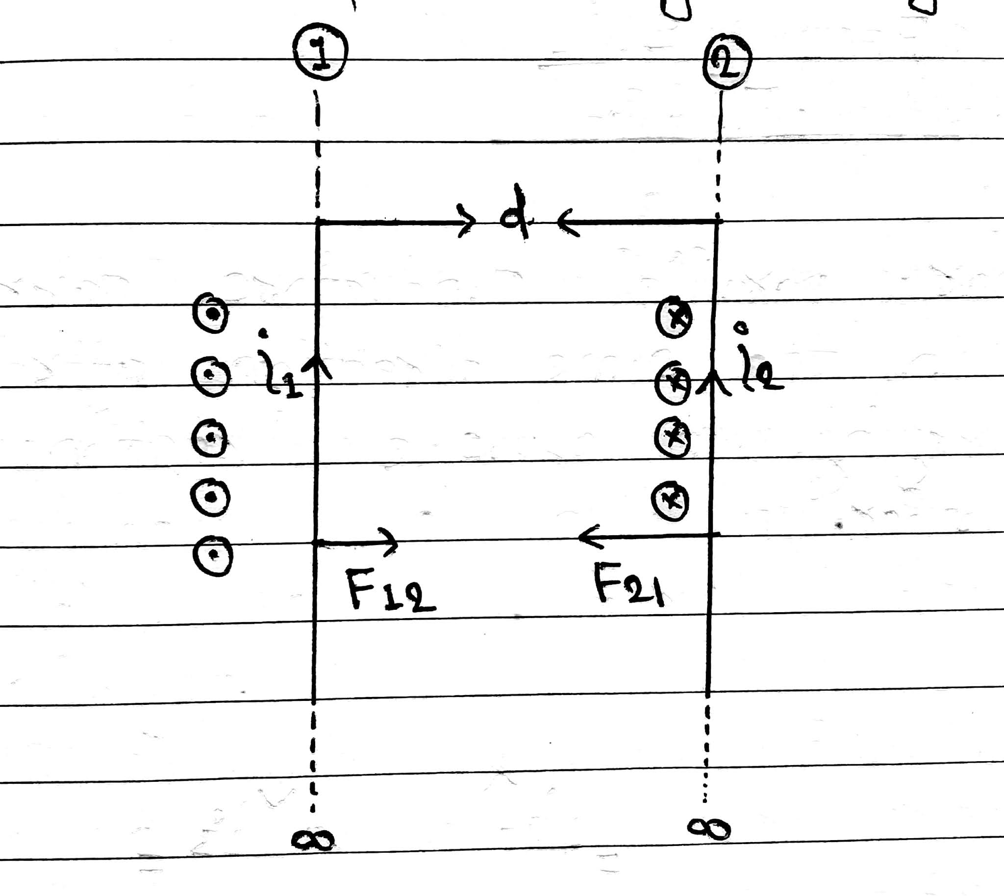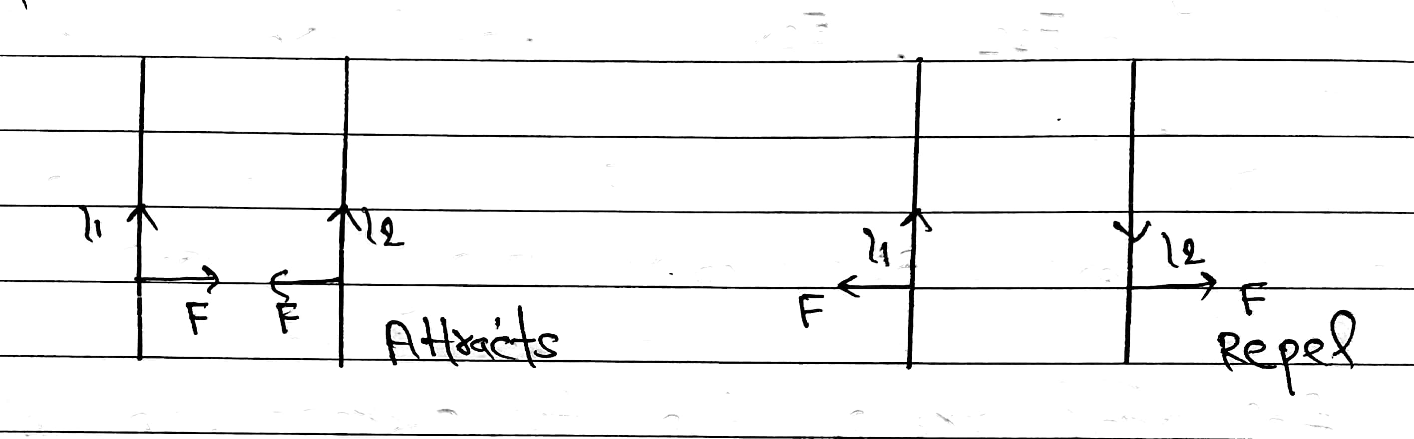 Note: Two linear parallel conductors carrying current in the same direction attract each other, while carrying in opposite direction they repel to each other.
