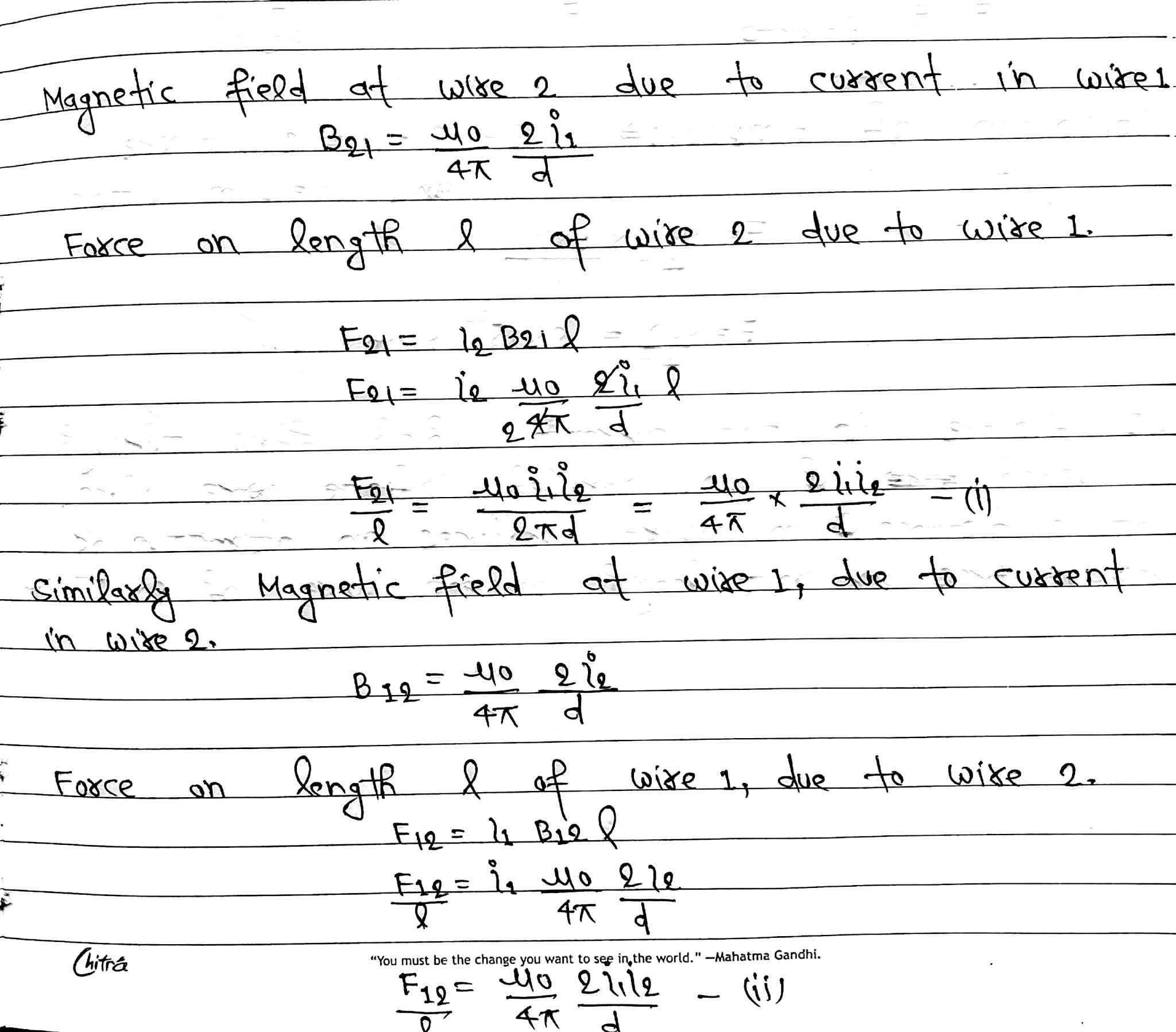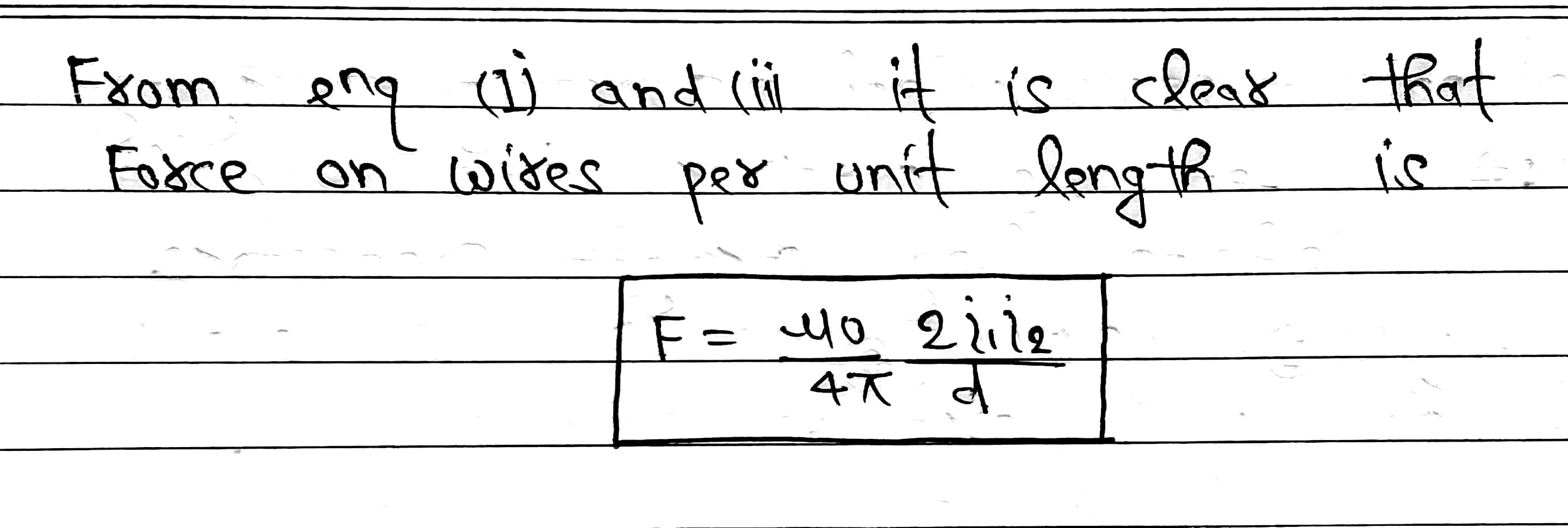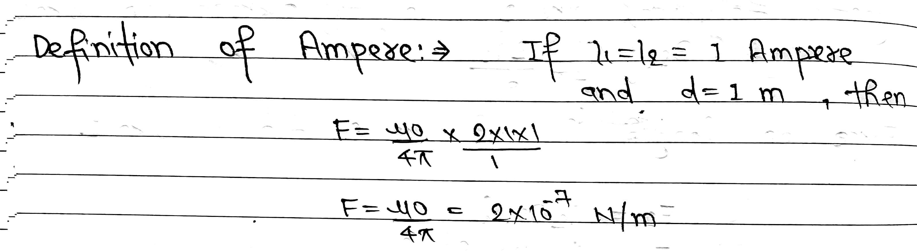 1 Ampere: 1 ampere is the current which flow through each of two parallel infinite wires placed at a distance of 1 metre apart produces an attractive or repulsive force per unit length between wire of 2×10⁻⁷ N/m.