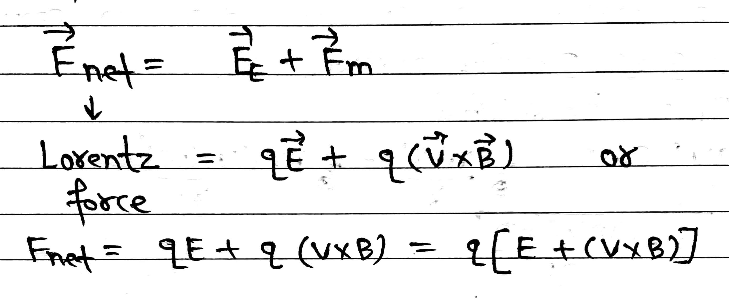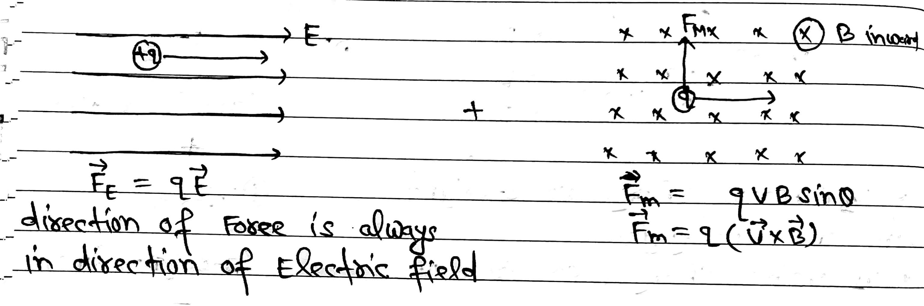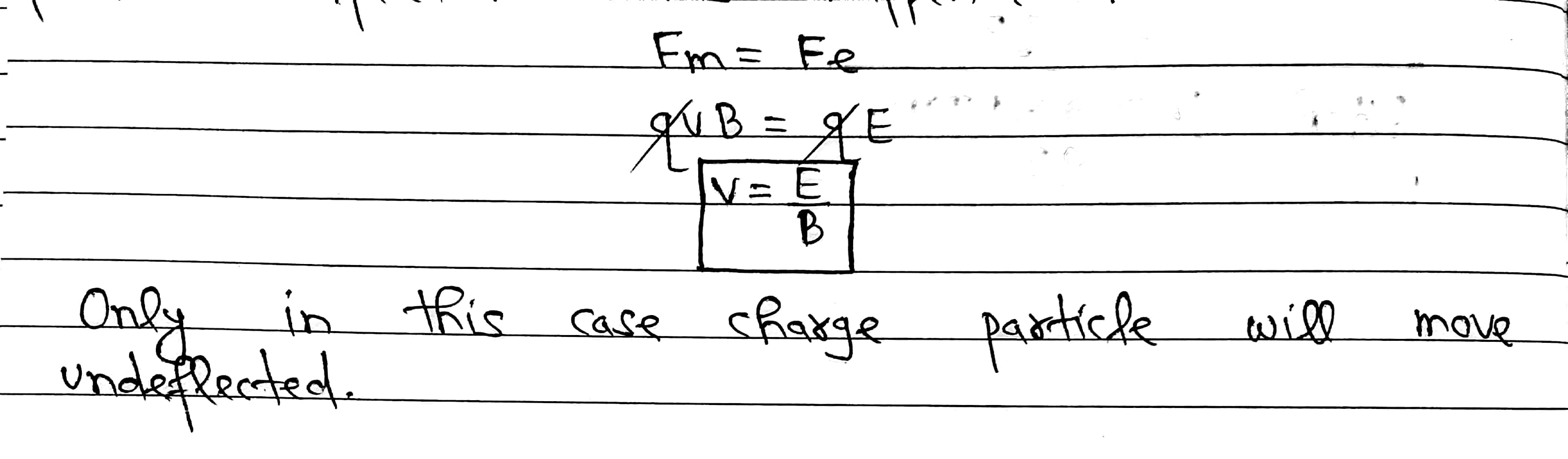 - If we adjust the value of E and B such that magnitude of two forces are equal and opposite in direction then total force on charge is zero and the charge will move in the field undeflected. This happen, when