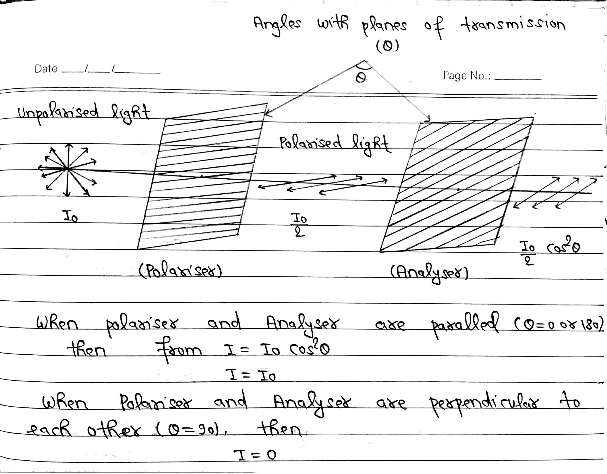 When unpolarised light passing through First slit S₁ will permit only those vibrations to pass through it which are parallel to the slit S₁ and will cut of all other vibrations. Thus the wave emerging from the slit S₁ is plane polarised. The slit S₁ is called polariser. If the second slit S₂ called the analyser, is held parallel to S₁, the wave from S1 will pass through S₂ unchanged. If S₂ is held perpendicular to S₁, no vibrations will emerge from the slit S₂. This indicates that the slit S₁ has polarised the incoming wave in the vertical plane.