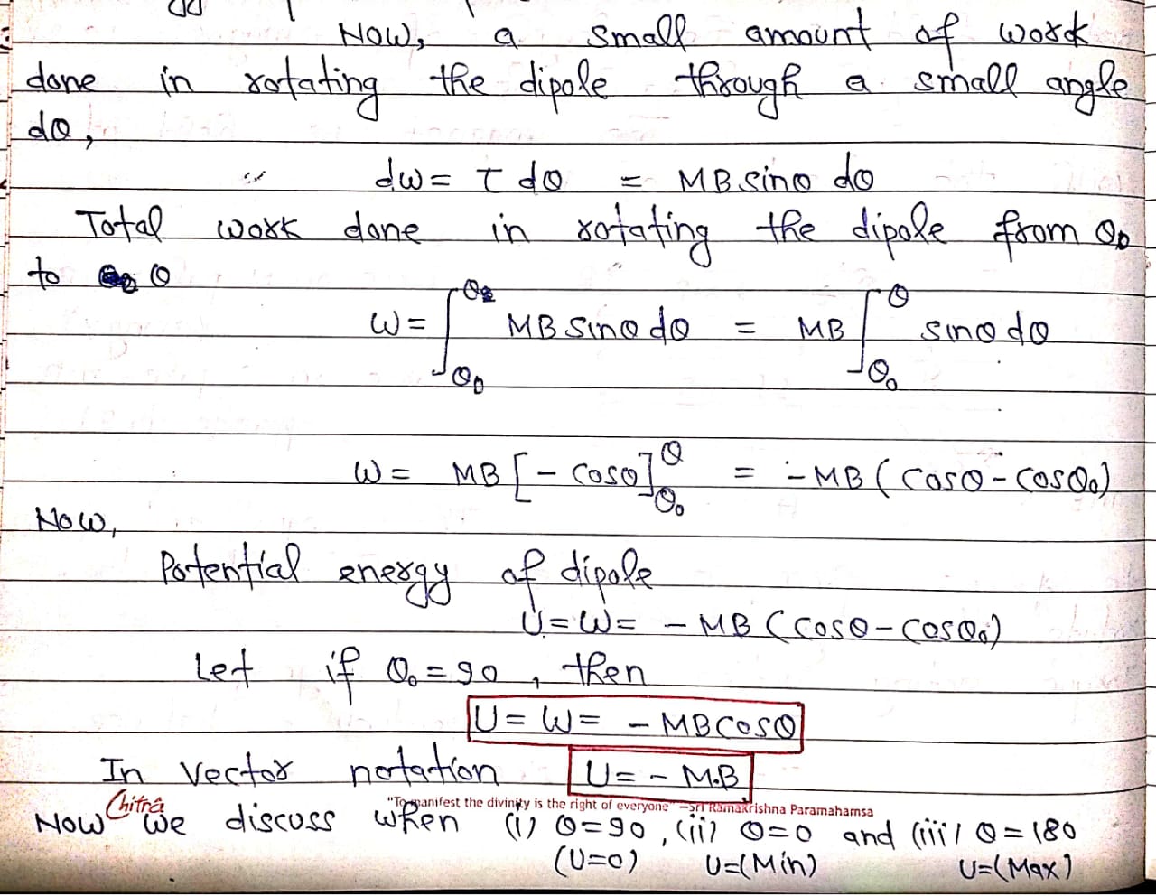 Potential Energy of a Magnetic Dipole (bar magnet) in a Magnetic Field: