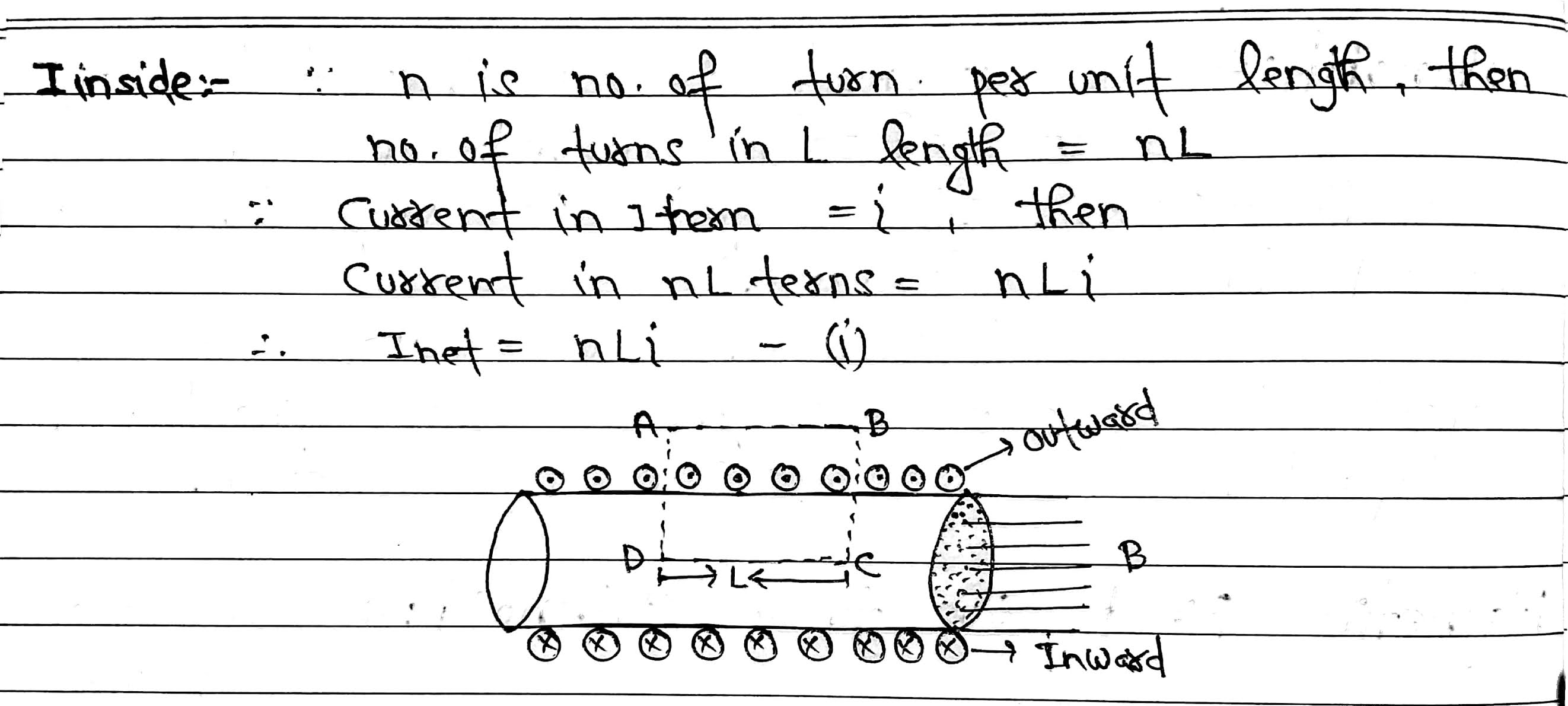 Derivation of Magnetic Field:let a solenoid having closely packed coil in which I is current, n is number of turns per unit length and B is magnetic field inside the solenoid.