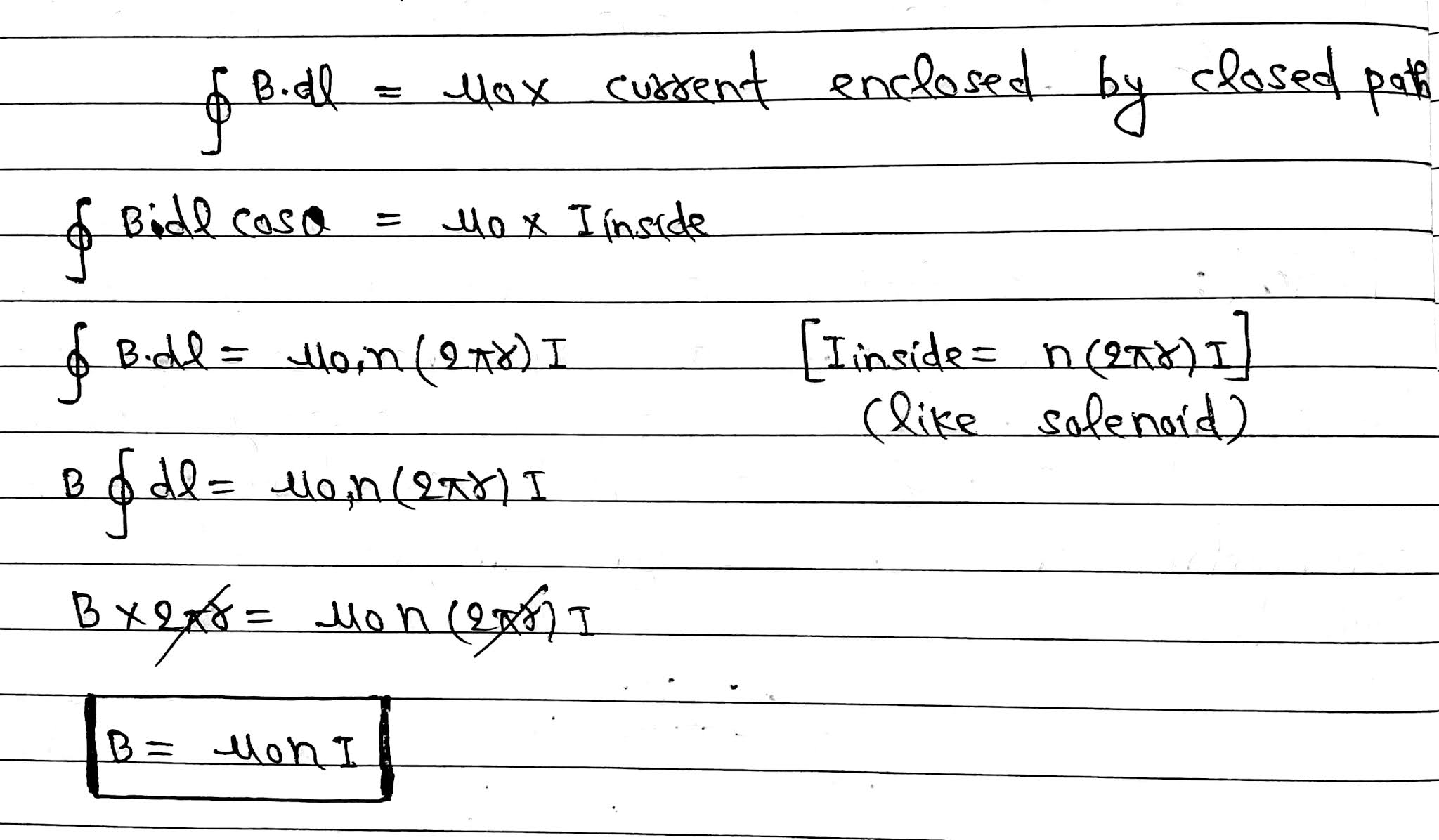 Let I be the current, r be the mean radius, n be the number of turns per unit length and B be the Magnetic field inside the toroid.